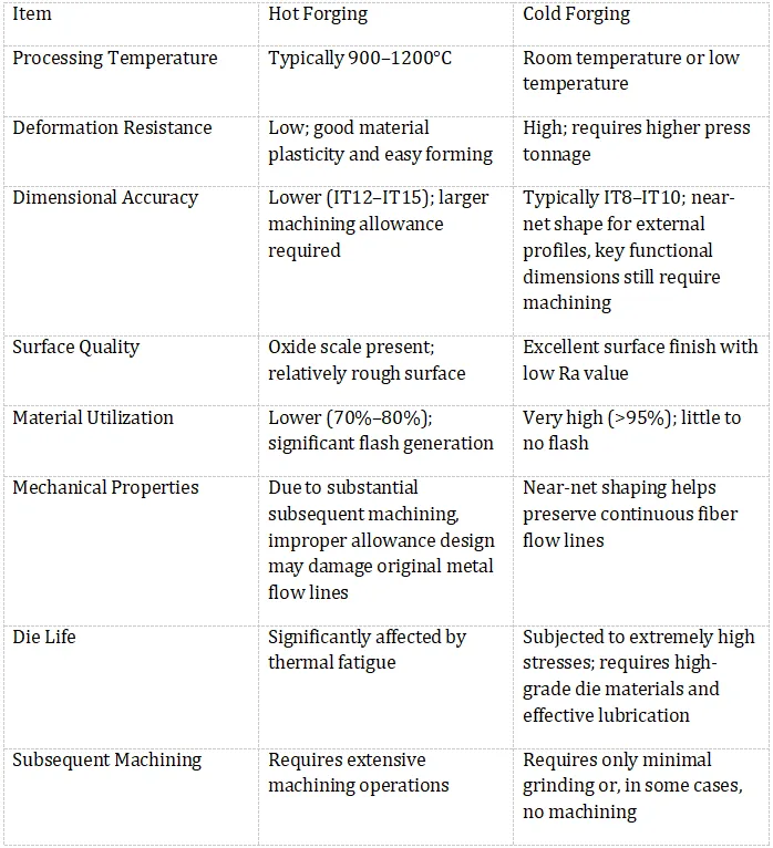 Cold forging, on the other hand, is performed at room temperature or under low-temperature conditions (typically without preheating the raw material), relying on high pressure to induce plastic deformation.